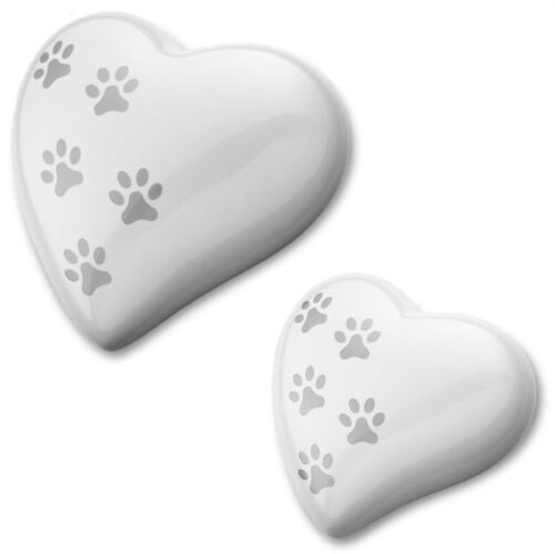 These heart-shaped urns have a contemporary look and are expertly crafted from aluminium. There come in glossy white with silver paw prints. There are two available sizes: small and medium. Each urn has a sealable screw-on base. The urn comes presented in a white organza bag as standard, and an optional display stand is available. This urn is suitable for display indoors only.